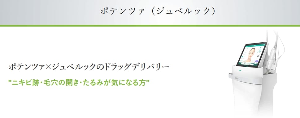 韓国に本院を持つ皮膚科専門クリニックならではの、豊富な薬剤オプションと技術力が魅力です。ポテンツァを「ダーマペンの進化版」と位置づけ、特にジュベルックを導入したニキビ跡・毛穴の治療に注力しています。