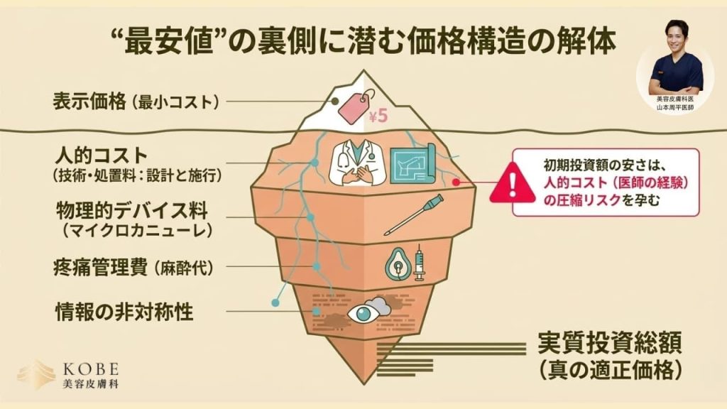 医療提供体制において、極端な低価格設定は「医師の臨床経験時間(人的コスト)」の圧縮を意味する可能性が高い。不適切な注入による合併症(血管閉塞やチンダル現象)が生じた場合、その溶解・修正コストは初期投資額を大幅に超過する。
